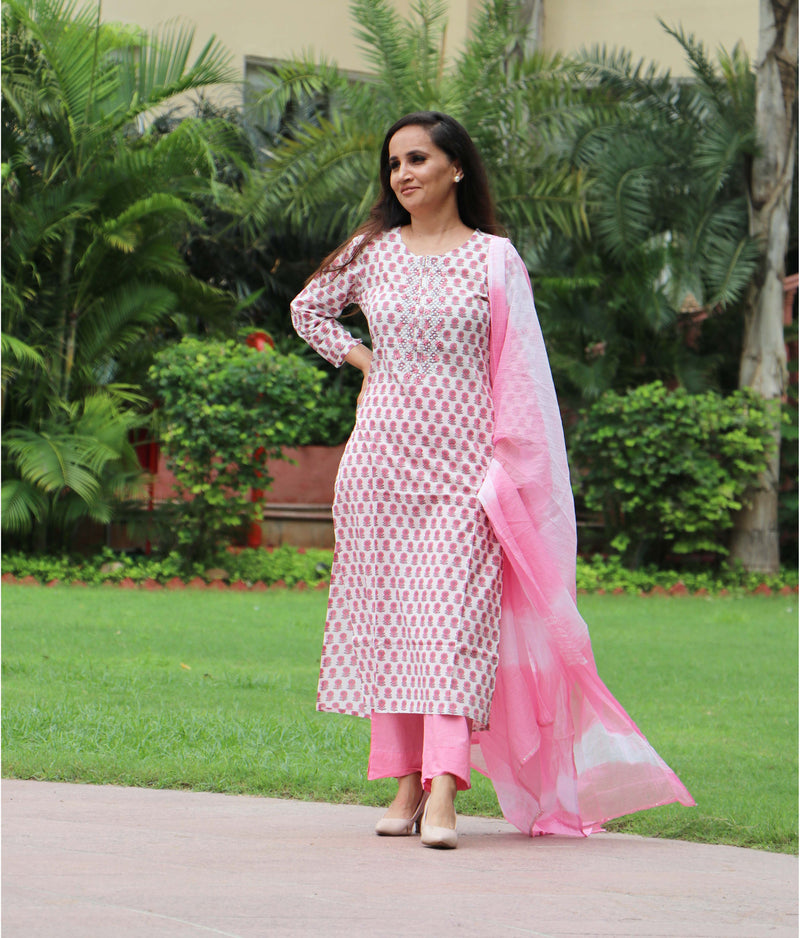 RED MAHESHWARI COTTON BLOCK PRINT DUPATTA SET