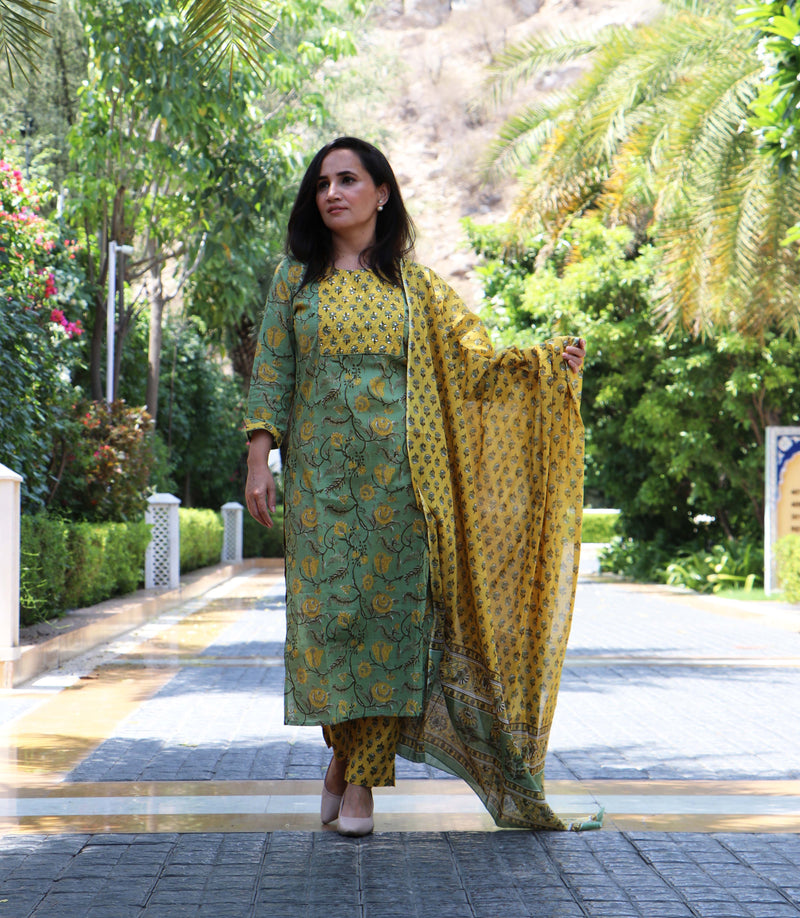 GREEN FLORAL COTTON SET DORIYA DUPATTA