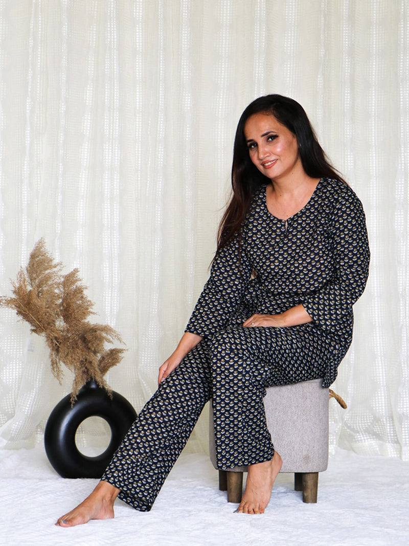 Women's Cotton Printed Pajama Top Nightsuit Set Navy-blue